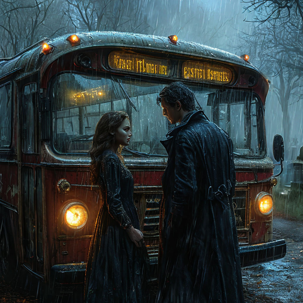 Когда автобус внезапно остановился у старых ворот кладбища, их объятия стали ещё крепче, словно оба знали, что время утекает сквозь пальцы. Туман за окнами клубился всё гуще, создавая интимную атмосферу вокруг них. Его руки скользили по её спине, притягивая её всё ближе, пока их тела практически слились воедино.
