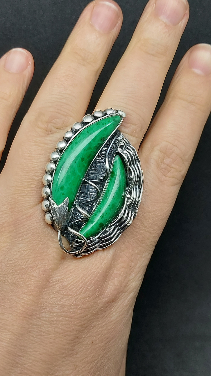 Серебряный перстень "Корзинка с горохом" с саянским жадеитом