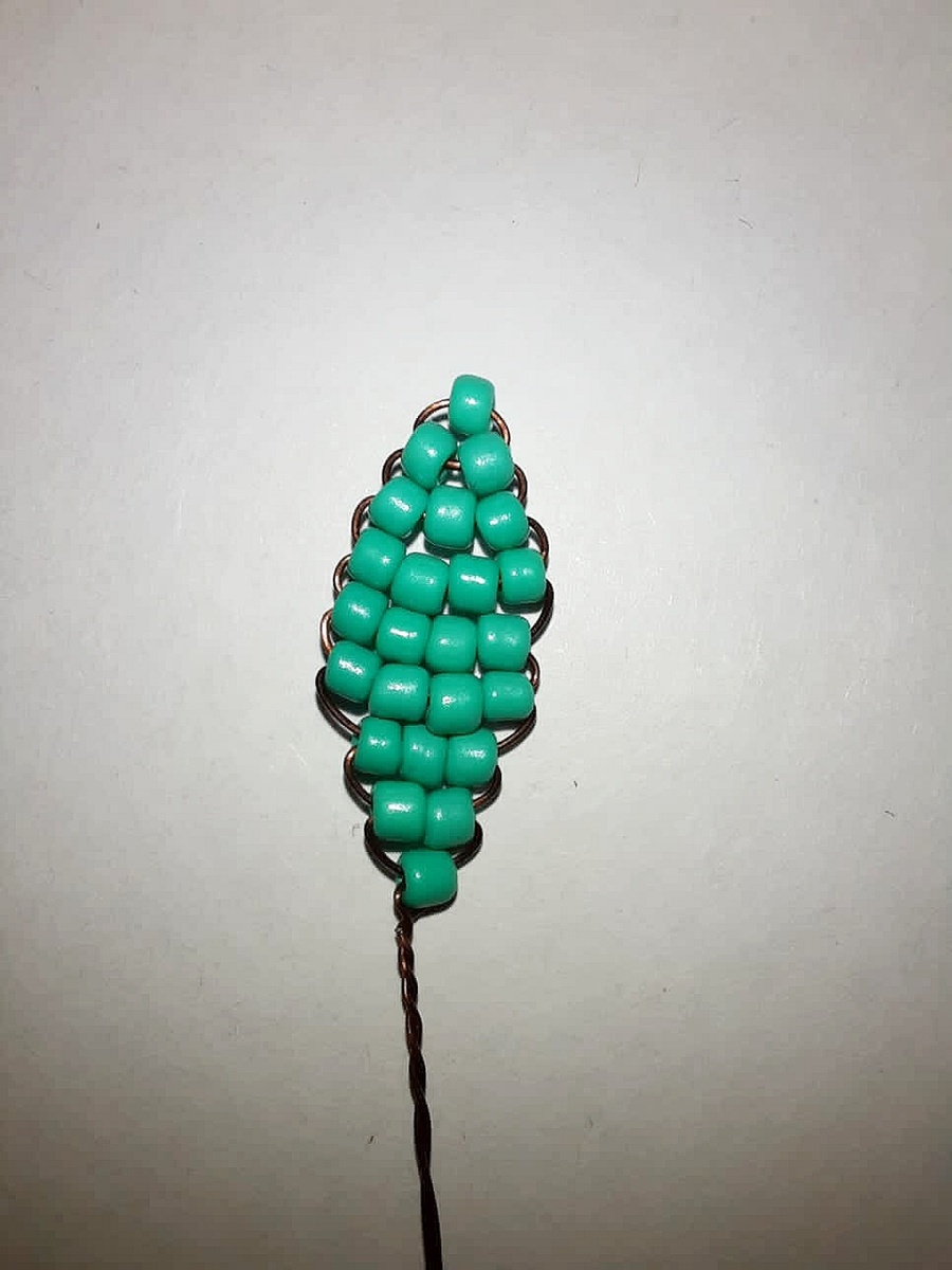 Листочки плетёные таким способом можно использовать отдельно,либо формировать из них веточки. 1.На кусок проволоки длиной 20см набрать 3 бисерины и расположить их посередине проволоки. 2.Один из концов проволоки пропустить через две бисерины навстречу другому.Плотно затянуть,получится треугольник.Концы проволоки должны быть одинаковой длины. 3.На один конец проволоки набрать 3 бисерины,а другой конец продеть через все бисерины.Готовый ряд подтянуть к предыдущему. 4.Аналогично выполнить следующие ряды.Количество рядов и бисеринок можно изменять в зависимости от нужного размера листика. 5.Когда листик будет закончен,концы проволоки крепко скрутить. Листик готов.