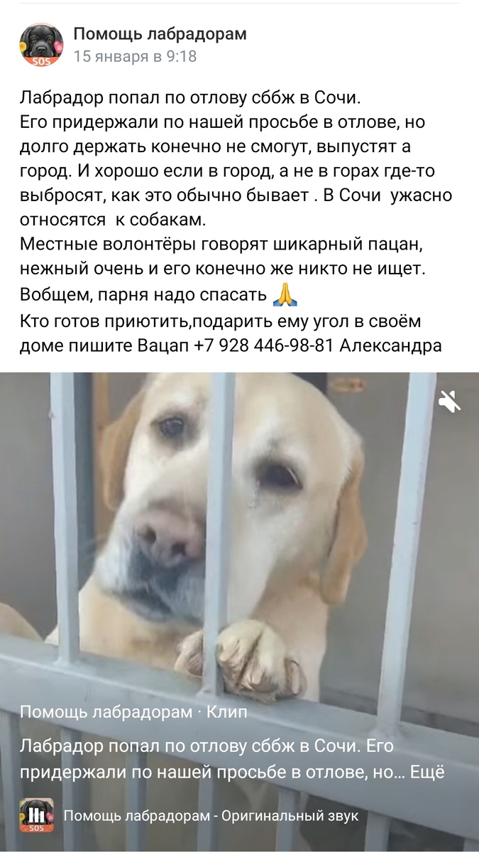 А началось всё с поста в ВК... "Лабрадор попал по отлову сббж в Сочи. Его придержали по нашей просьбе в отлове, но долго держать конечно не смогут, выпустят а город. И хорошо если в город, а не в горах где-то выбросят, как это обычно бывает . В Сочи ужасно относятся к собакам. Местные волонтёры говорят шикарный пацан, нежный очень и его конечно же никто не ищет. Вобщем, парня надо спасать 🙏 Кто готов приютить,подарить ему угол в своём доме пишите " *** В Сочинский отлов попал лабрадор. Красавец, умница и ласкуша🤗 Проблема была в том, что держать его там долго не могли, хозяин ни старый, ни новый не находился. И перспектива у Барни была одна - бродяжничать по Сочинским улицам в поисках еды и приключений. Мы тут же написали, что готовы принять парня, но нужно, чтобы кто-то занялся отправкой в Крым. В ответ... тишина... Но... Если что-то должно сложиться, то оно складывается. В это время в Сочи оказалась моя подруга Наталья с семьёй , она увидела и пост о помощи и наш коммент