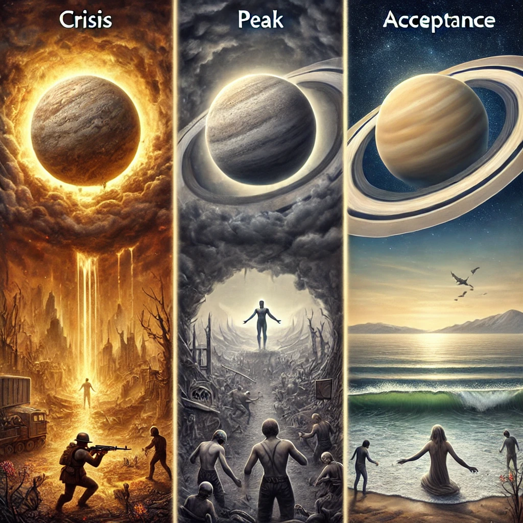 Циклы Сатурна: Каждые 3 года новые испытания Транзит Сатурна длится около 2,5 в одном знаке. Он проходит три ключевые фазы, и в это время весь мир проживает новое испытание. Этот процесс всегда один и тот же: 1️⃣ Рождение кризиса – шок, паника, неизвестность. Люди не понимают, что происходит, общество охвачено страхом и напряжением. 2️⃣ Пик событий – когда тема захватывает всё информационное поле, люди находятся в максимальном напряжении. 3️⃣ Принятие – когда страх исчезает, истерии больше нет, люди просто привыкают жить с этим. Как это работает? 🔹 эпидемия COVID-19. — Сначала шок и страх: вирус, локдауны, неопределённость. — Затем пик: массовые запреты, ограничения, прививки, протесты. — В итоге принятие: ковид никуда не делся, но всем стало всё равно. 🔹 конфликт России и Украины, мировой кризис. — Шок: страх, санкции, экономическая неопределённость. — Пик: активные боевые действия, напряжение во всём мире. — Принятие: люди просто живут с этим, страх сменился будничным восприя