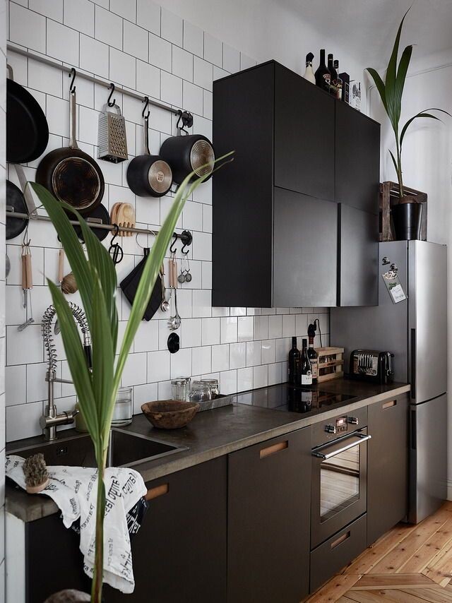 Черная кухня - смелый и необычный вариант. При правильном оформлении она смотрится красиво и стильно. Останавливая выбор на самом темном цвете, стоит учитывать некоторые особенности: Поэтому такая кухня подходит для больших помещений - площадью не меньше 15 квадратных метров с высокими потолками и хорошей освещенностью. Матовые покрытия более практичные и проще в уходе, чем глянцевые. Фасады должны быть простыми, с четкими линиями. Черная кухонная мебель хорошо сочетается с белым цветом и с деревом. Яркие акценты - желтые, красные, синие или розовые детали - сделают черную кухню менее мрачной. А комнатные растения придадут жизненной энергии.