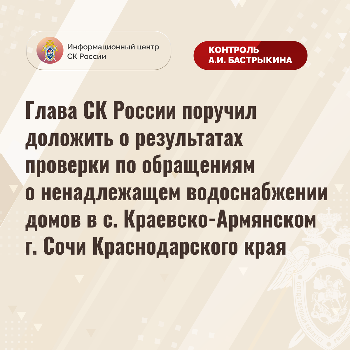 Глава СК России поручил доложить о результатах проверки по обращениям о ненадлежащем водоснабжении домов в с. Краевско-Армянском г. Сочи Краснодарского края