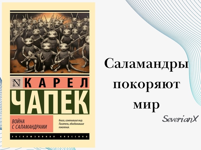 Мне приходилось читать довольно мало литературы родом из Чехии, а значит пора расширять географические горизонты. «Война с саламандрами» – нетипичная сатирическая антиутопия, сочетающая в себе элементы научной фантастики, политической аллегории и философской притчи. Через историю о разумных земноводных, которых человечество превратило в инструмент собственной жадности, автор создаёт многогранную критику капитализма, колониализма, фашизма и безответственного технологического прогресса. В первую очередь книга интересна своей структурой: роман построен как псевдодокументальный коллаж, в котором газетные статьи, научные отчёты, дипломатическая переписка и даже рекламные объявления формируют мозаику событий. Все началось с бравого капитана ван Тоха, который и нашел первых саламандр на далёком необитаемом острове. Аборигены с соседних островов знали о необычных созданиях, но обходили их стороной, считая демонами. Бравого капитана это не остановило, и вскоре он смог наладить с саламандрами ко