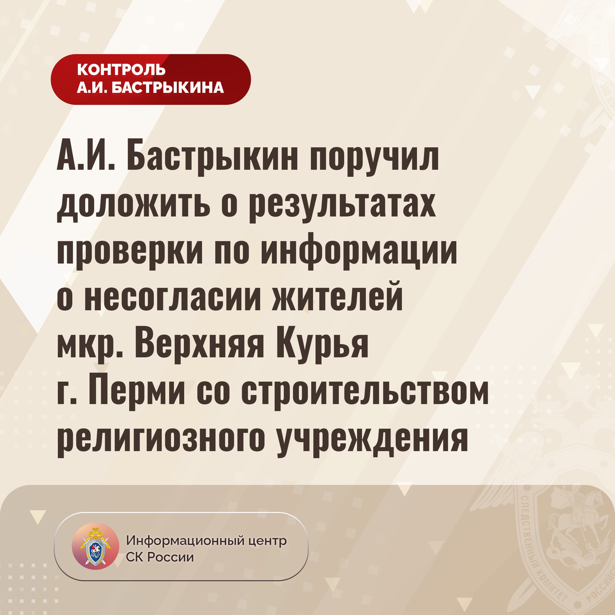 А.И. Бастрыкин поручил доложить о результатах проверки по информации о несогласии жителей мкр. Верхняя Курья г. Перми со строительством религиозного учреждения В СМИ размещена публикация о несогласии жителей микрорайона Верхняя Курья города Перми со строительством религиозного учреждения, который может стать местом скопления мигрантов. Также сообщается, что на территории района отсутствуют медицинские учреждения, отмечается нехватка мест в детских садах и секциях, однако мер к строительству объектов социальной инфраструктуры не принимается. Ранее А.И. Бастрыкин ставил указанную ситуацию на контроль в центральном аппарате ведомства. В СУ СК России по Пермскому краю по данному факту проводится процессуальная проверка. Председатель Следственного комитета Российской Федерации Александр Иванович Бастрыкин поручил руководителю СУ СК России по Пермскому краю Денису Валерьевичу Головкину доложить о результатах процессуальной проверки и установленных обстоятельствах. Исполнение поручения постав