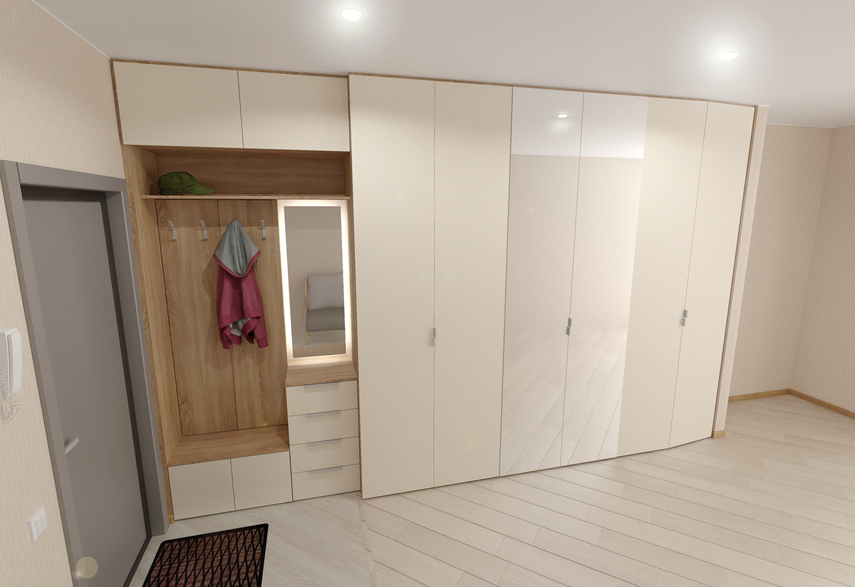 Потенциальный клиент попросил спроектировать шкаф в прихожую. Он попросил два варианта сделать, с открытой секцией и без. Цена конечно разная получилась. Есть куда присесть. Электрический щиток закрыл дверками. Конечно же были пожелания от клиента, постарался учесть. Зеркало я ему сам воткнул подсветил, можно и без этого обойтись. Широкие ящики мне кажется не лучшая идея. Для того чтобы ящик выдвинуть, нужно открыть обе двери, затем тянуть на себя большой короб. Ну не знаю... мне кажется неудобно.