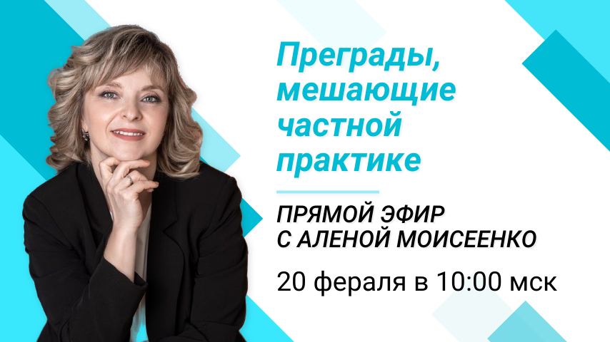 Приглашаем всех, кому важно понимать, как строить частную практику без ошибок, на прямой эфир с Аленой Моисеенко, наставником для коучей, создателем школы «Успешного родителя». 20 февраля в 9:30 по московскому времени ждем всех на эфире «Преграды, мешающие успешной частной практике» Эфир пройдет на площадке ZOOM по ссылке: