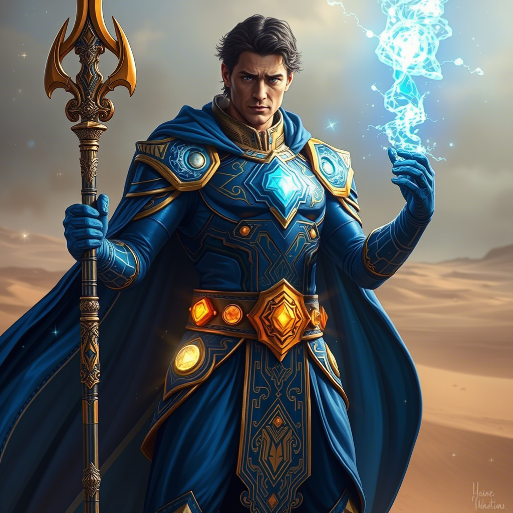 Космос стоял посреди пустыни Эль-Астрии 🌋✨, на планете Зенотар , где песок был необычного цвета — переливался оттенками золота и серебра под лучами двух солнц. Этот мир был удивительно чистым и настолько прозрачным, что Космос снял свой шлем, чтобы в полной мере прочувствовать запах чистого и сладкого воздуха (странно но он имел сладкий запах). Его лицо, обычно скрытое под индиго броней, было спокойным, но наполненным восхищением перед природой этого места 🌬️💫. В его правой руке находился посох, который теперь казался сухой палкой, лишенной всякой энергии. Он больше не источал свет или силу, утратив свою магию. Но вместо разочарования, Космос чувствовал странную гармонию с этим состоянием 🙏✨. Иногда простота — это тоже своего рода сила.Из левой ладони медленно вытекал голубой дым. Космос ощущал себя здесь как исследователь нового мира, даже несмотря на то, что его верный посох теперь был без энергии.