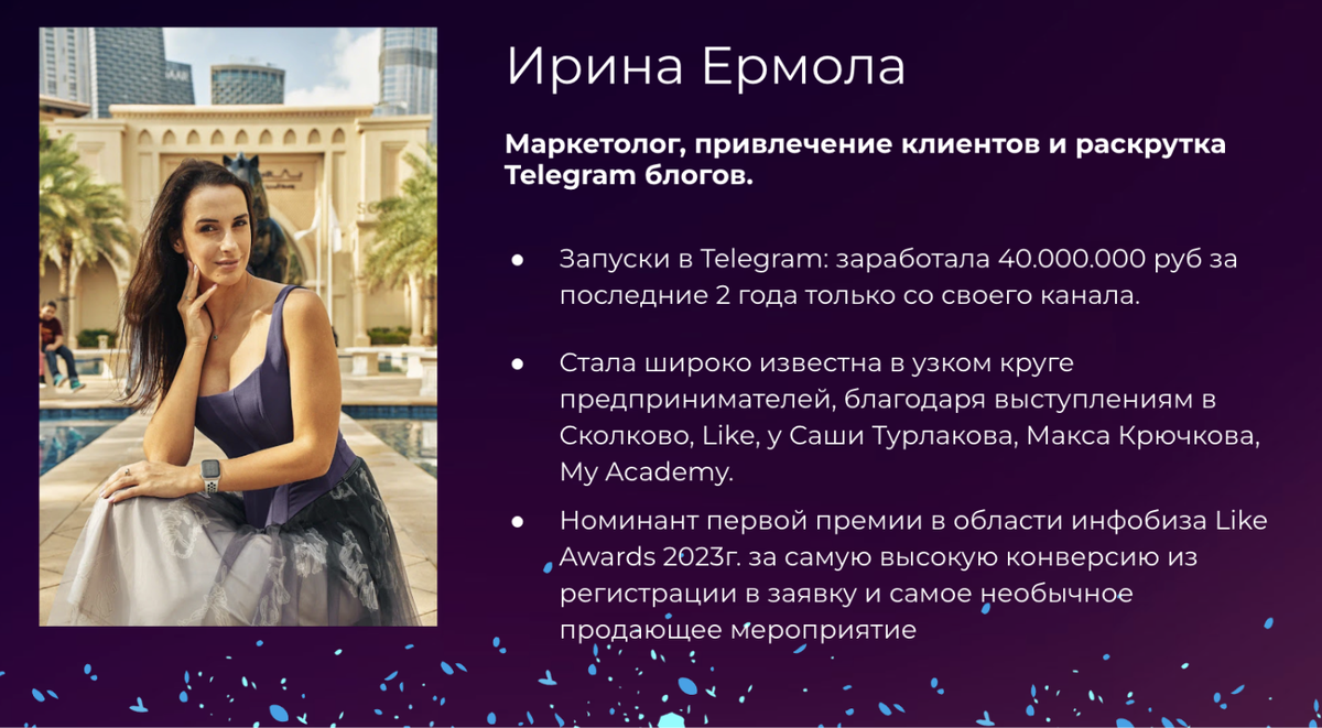 Прежде всего у меня заранее был сформирован авторитет среди участников: им меня представил Дмитрий, мой клиент, с которым мы работали уже целый год. За это время благодаря продвижению в телеграм, которое я делала для онлайн школы Дмитрия, им удалось заработать немало млн руб)
