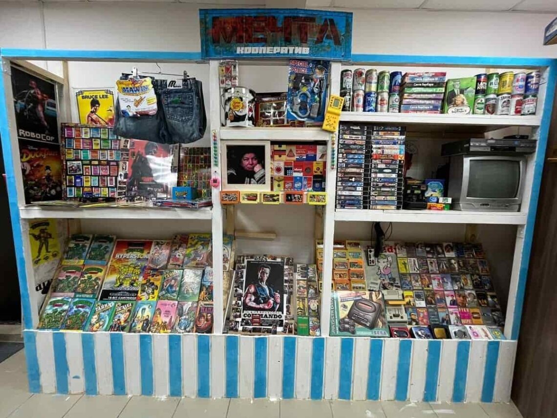 Уже на входе гостей, которые хорошо помнят те времена, охватывает ностальгия: из раритетного телевизора слышатся заставки диснеевских мультиков. На витринах ларька – самые популярные и желанные товары детей девяностых: комиксы, жвачки, книги, игры для приставок, игрушки, постеры, джинсы «мальвины». Основатель музея Виктор Павлов объясняет: эта экспозиция и ему самому напоминает о детстве – в 90-х он как раз учился в школе. «Оформить такую выставку хотел давно – и кое-какие экспонаты имелись, и посетители высказывали пожелания, мол, предметы из восьмидесятых у вас представлены, хотелось бы увидеть что-то из девяностых/ Сделать ее в виде ларька решил потому, что хорошо помню подобные киоски, где тогда покупали буквально всё – от жвачки до бытовой техники. Сам с друзьями частенько после школы «тусил» у таких, иногда что-нибудь брали на сэкономленные на школьных завтраках деньги. Поскольку многие вещи были в дефиците, для большинства ребят приобрести какие-то из них иногда становилось мечт