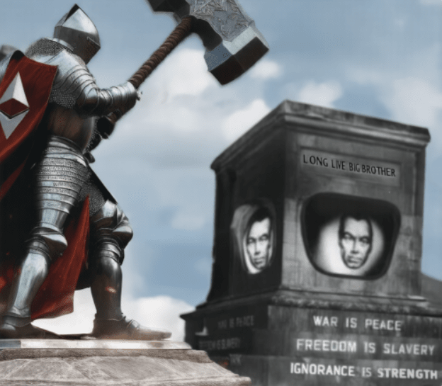 Примечание Mars Finance: Текст на картинке взят из романа (1984) «Война — это мир, свобода — это рабство, невежество — это сила».
