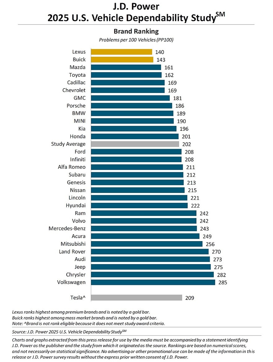 Рейтинг надёжности J.D. Power 2025: Lexus опять лучший, VW скатился на последнее место