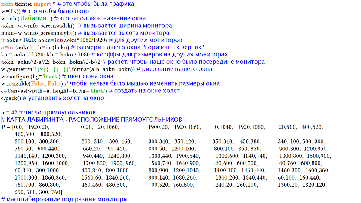 Предлагаю заготовку для создания игры, где надо ходить по лабиринту. Вот текст программы на Питоне: from tkinter import * # это чтобы была графика w=Tk() # это чтобы было окно w.title('Лабиринт') # это заголовок-название окна aokn=w.winfo_screenwidth() # вызывается ширина монитора bokn=w.winfo_screenheight() # вызывается высота монитора if aokn<1920: bokn=int(aokn*1080/1920) # для других мониторов a=int(aokn); b=int(bokn) # размеры нашего окна: 'горизонт. х вертик.' ka = aokn / 1920; kb = bokn / 1080 # коэффы для размеров на других мониторах aokn=aokn//2-a//2; bokn=bokn//2-b//2 # расчёт, чтобы наше окно было посередине монитора w.geometry('{}x{}+{}+{}'.format(a,b, aokn, bokn)) # рисование нашего окна w.configure(bg='black') # цвет фона окна w.resizable(False, False) # чтобы нельзя было мышью изменить размеры окна c=Canvas(width=a, height=b, bg='black') # создать на окне холст c.pack() # установить холст на окно n = 42 # число прямоугольников # КАРТА ЛАБИРИНТА - РАСПОЛОЖЕНИЕ ПРЯМОУГ