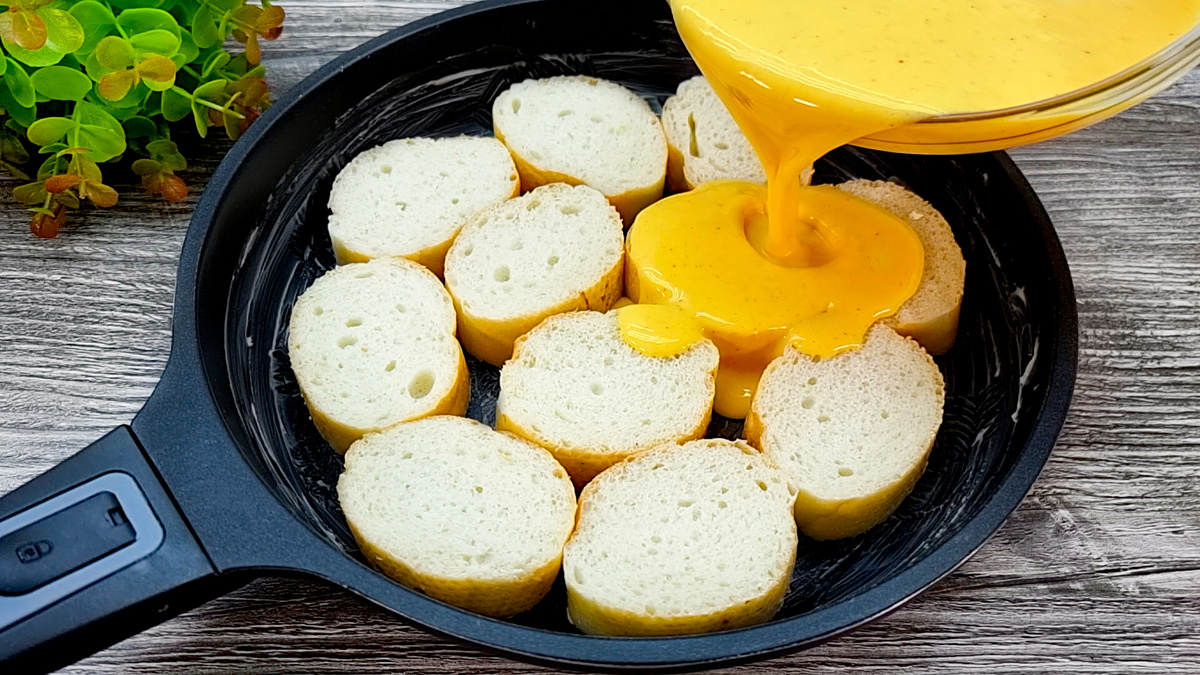 Если хотите быстро приготовить вкусный и сытный завтрак для всей семьи, то обязательно обратите внимание на этот рецепт. Думаю понравится! По желанию можно добавить - бекон, красный перец, зелень, помидор. Все зависит от предпочтений и фантазии. Ингредиенты: 1 багет (лучше черствый); сливочное масло; 5 яиц; 200 г белого йогурта; соль, перец, паприка, куркума; 100-120 г сыра; Способ приготовления: Багет нарезать ломтиками и