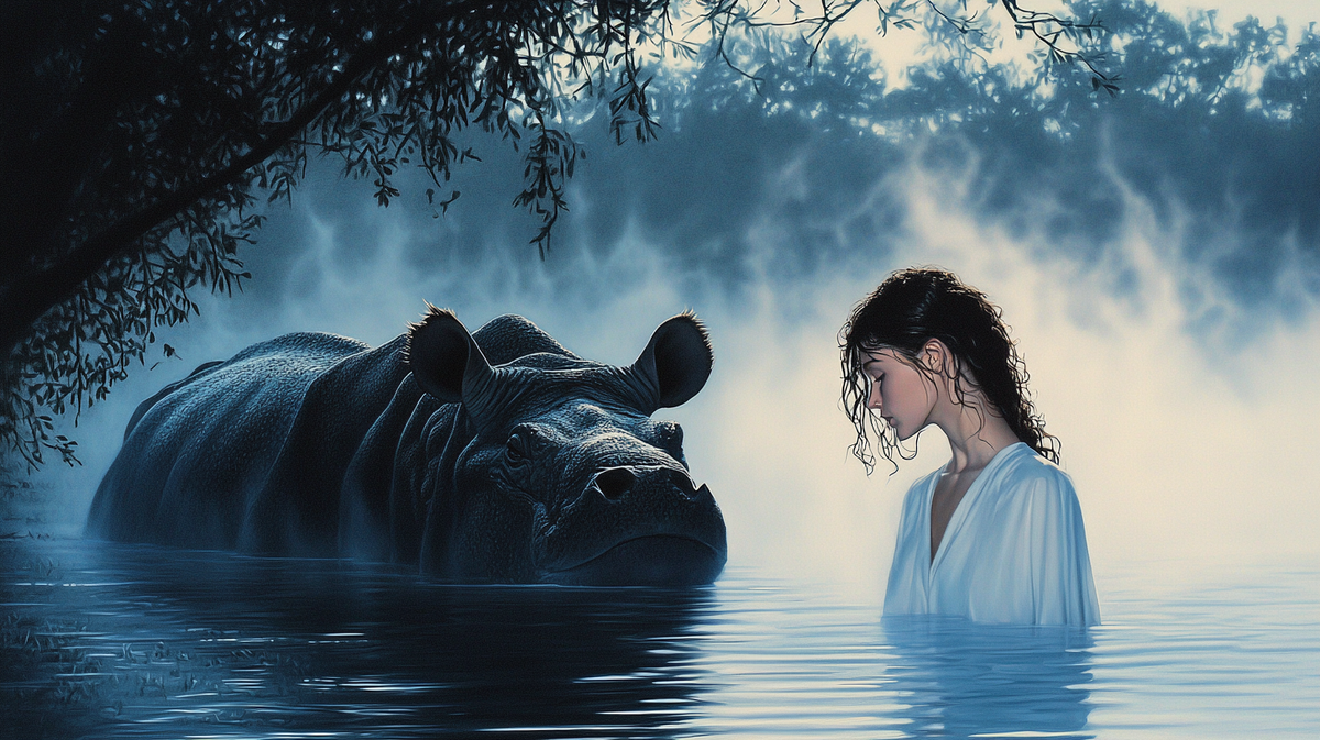 Мы видим озеро, окутанное лёгкой дымкой. В воде сидит загадочное животное, чьи очертания напоминают смесь различных крупных зверей (носорог, бегемот, тапир), словно собравшиеся воедино. Девушка зашла по щиколотку в воду, чтобы лучше разглядеть незнакомца. Её нижняя часть тела обнажена, что подчёркивает уязвимость и любопытство одновременно. Она тянется к загадочному существу, стараясь приблизиться, однако не спешит удаляться от берега, ведь её беспокоит природный страх перед неизвестностью.