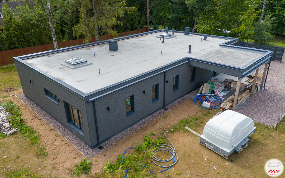 На днях выкладывал фотографии одноэтажного дома из газобетона на УШП в Лисьем Носу: Повторяться не буду, прошлый пост (и ещё парочку) можно посмотреть в подборке на Dzen: Здесь же кратко дополню по текущей стоимости реализации этого проекта. Примерная стоимость аналогичного одноэтажного газобетонного дома размерами 12,4 м * 22,2 м, на утепленной шведской плите (далее УШП) с террасой и крыльцом, автонавесом составляет: 1. Стоимость фундамента УШП (с очистными сооружениями) площадью 251,5 м2, терраса на бетонных сваях 23,8 м2, крыльцо на монолитной плите площадью 5 м2 + автонавес площадью 29,8 м2: