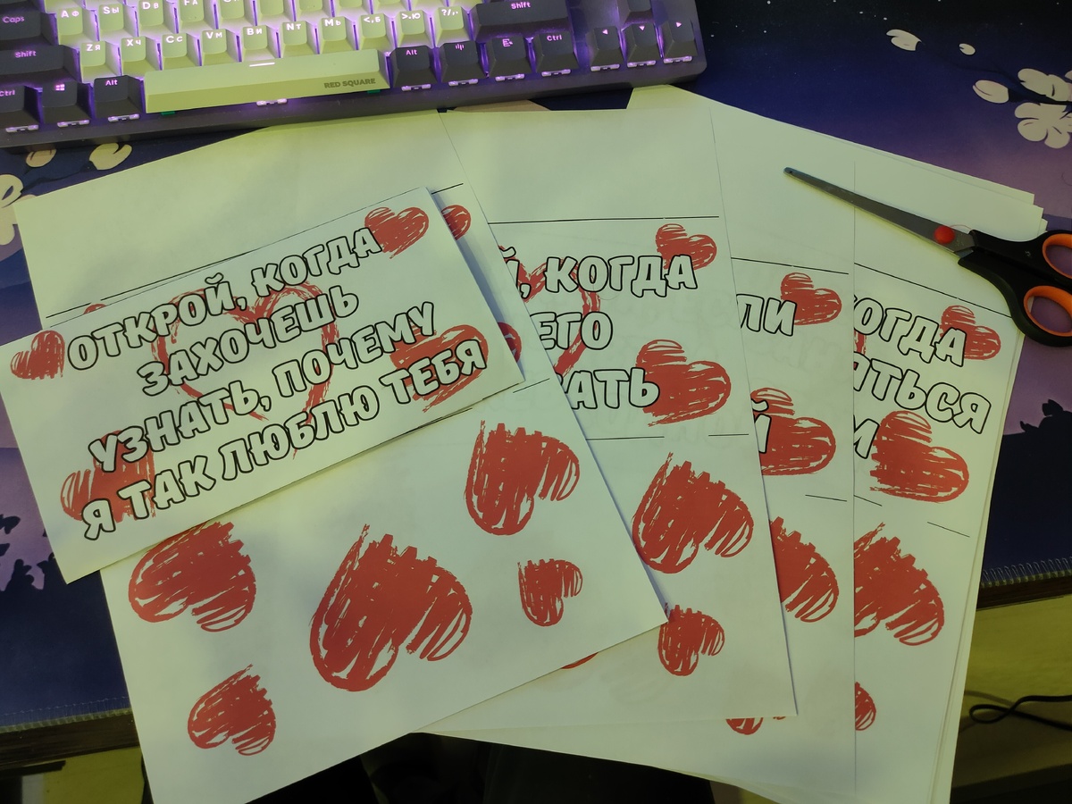 Создание любовных конвертов "Открой, когда" — это отличный способ выразить свои чувства и добавить немного романтики в отношения. Эти конверты могут содержать милые заметки, пожелания или даже маленькие подарки, которые ваша вторая половинка сможет открыть в особые моменты. В этой статье я расскажу, как сделать такие конверты своими руками. В моем шаблоне готово 15 конвертов 2. Оформление: В фотошопе вы можете изменить дизайн конвертов, также рекомендую убрать верхнюю направляющую, так как по данной линии конверт не сложится, тем более, если в него что-то положить. Я сделал для каждого конверта красочные карточки. Данные карточки можно распечатать на фотобумаге А4 и вырезать, но я распечатал на обычной и заламинировал это всё дело. Я сделала для этого наклейки в форме сердца и распечатал их на самоклеющейся бумаге, но можно и на обычной распечатать и приклеить на двусторонний скотч. К сожалению, в мою коробку все конверты не влезли и я сделал большой конверт из крафтовой упаковочной