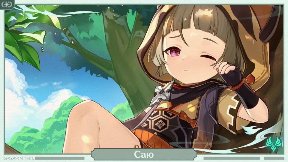 ㅤСаю — эпический Анемо персонаж из Инадзумы. Соня и юный растущий организм, что уже пользуется тяжёлым двуручным мечом. Также она скрытно работает на Комиссию Ясиро, ведь может скрываться от посторонних глаз, чтобы эффективно собирать информацию.