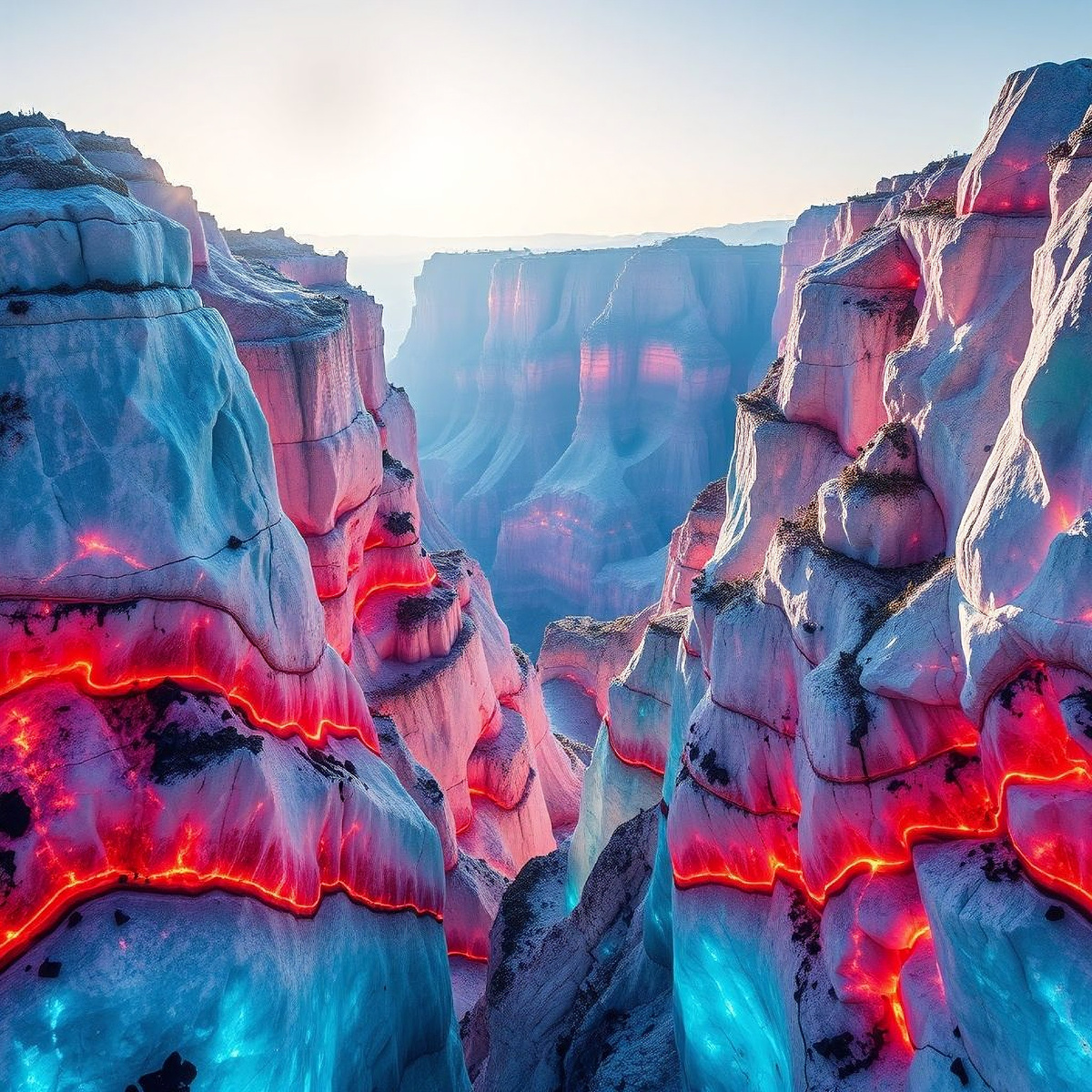 942 год мира Этерион Я шел за Элиндором по узкой тропе, вьющейся вдоль обрыва. Воздух здесь был резким, как лезвие, и каждый вдох обжигал легкие. Каньон напоминал гигантскую рану на теле мира: стены из разноцветного кристалла вздымались на сотни метров, переливаясь под холодным солнцем. Красные жилы, словно застывшая лава, пересекались с синими прожилками, пульсирующими влагой, а чёрные осколки, торчащие из скал, поглощали свет, оставляя вокруг себя мрак.