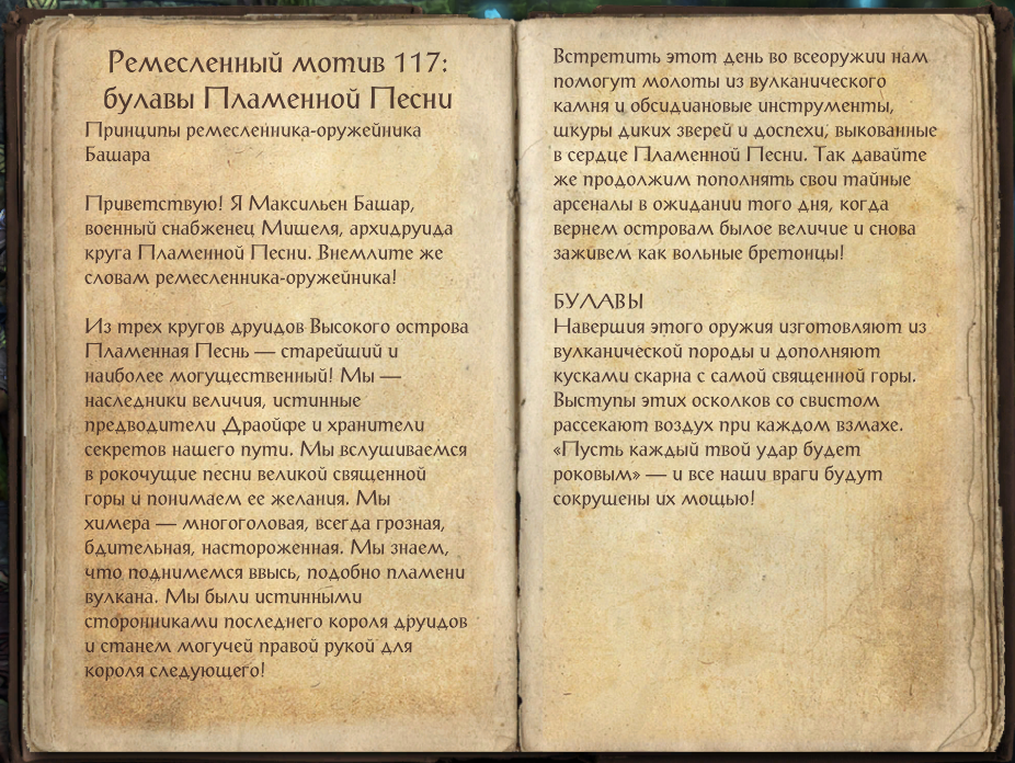 Встретить этот день во всеоружии нам помогут молоты из вулканического камня и обсидиановые инструменты, шкуры диких зверей и доспехи, выкованные в сердце Пламенной Песни. Так давайте же продолжим пополнять свои тайные арсеналы в ожидании того дня, когда вернем островам былое величие и снова заживем как вольные бретонцы!