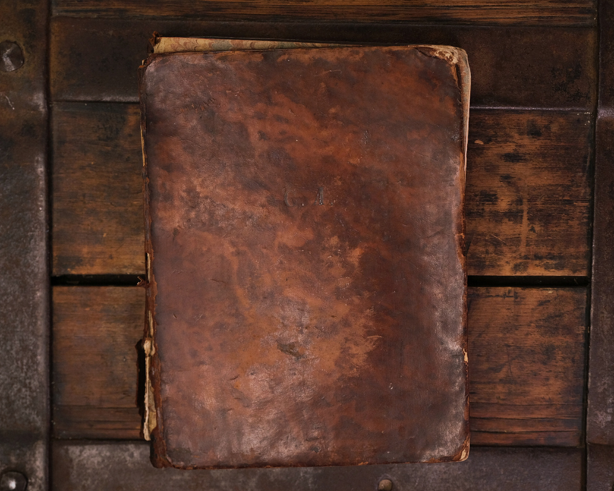 Издание пришло с загрязнениями, различными повреждениями по переплёту и ослабленным блоком. Одна из сторонок полностью оторвалась от корешка. Работа со старинной кожей требует особой аккуратности, чтобы стыки на местах разрывов оказались не видны.