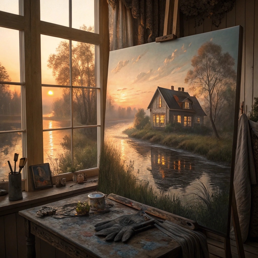 Высокий, молчаливый. В потёртом коричневом пальто, с тонкими пальцами, пахнущими маслом и скипидаром, он снимал мастерскую на последнем этаже дома, чьи окна выходили на осеннюю реку. Его звали Лео Марин, но никто не знал, настоящее ли это имя. Лео писал миры – не обычные пейзажи или натюрморты, а целые вселенные, пронизанные мягким светом заката, тихими отражениями в прудах и домами, окна которых светились в сумерках, словно маня за собой. Люди не заметили, как он исчез. Просто однажды его дверь оказалась запертой, и никто больше не видел его на узких улочках города. Однако картины остались – и с ними начались странности. В доме коллекционера, купившего одно из полотен, случайно обнаружили в углу картины кисть – такую же, как те, что Лео использовал в своей мастерской. В другом доме, где висела другая его работа, на столе среди нарисованных предметов кто-то разглядел перчатки – те самые, что он носил зимой. Кто-то утверждал, что в сумерках в нарисованном доме загорается свет.