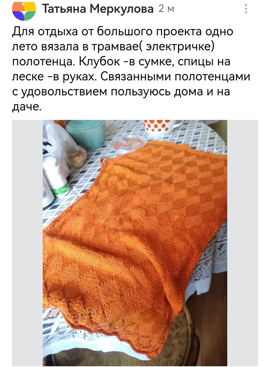 Если честно, мне самой бы и в голову не пришло, что кухонное полотенце можно связать. Если бы не мои любознательные читатели, которые не боятся применять самые смелые идеи и делятся с нами в комментариях: Скажу откровенно, два месяца назад, когда я прочла этот комментарий, идея меня не очень заинтересовала. Наверное, потому, что у меня в голове прочно сидело убеждение, что кухонное полотенце - чисто утилитарный предмет. Попользовался, пришло в негодность, выбросил. Жизненный цикл у этого предмета обихода довольно короткий. В продаже их большое разнообразие на любой случай и кошелек. Так зачем тратить на них свое время и пряжу. Да, так я думала сначала. Кстати, таким же образом многие думают (или думали раньше) и в отношении вязаных носков🧦 А посмотрите, как стремительно меняется в этом вопросе мнение вязальщиц последние несколько лет. Многие поняли, что вязаные носки - это практично, красиво, удобно, интересно. И с упоением вяжут прекрасные носки для себя и близких, собирая целые