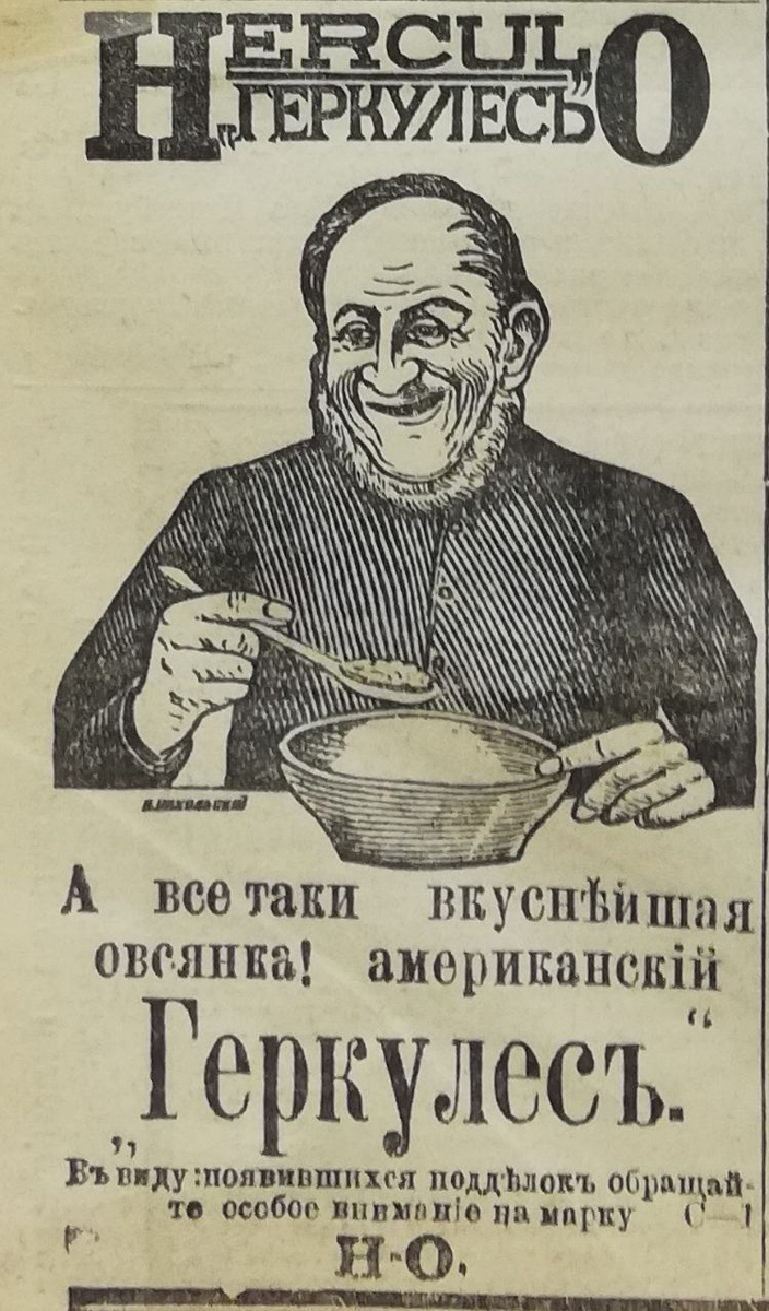 Реклама бывает хорошая, плохая и та, которую трудно забыть. Ретро (винтажная) реклама тем и хороша, что сегодня воспринимается, как некий отпечаток истории. Не переключайтесь! В конце XIX и начале XX века реклама ворвалась в жизнь обывателя. Первая дореволюционная полиграфическая реклама выглядела как произведения искусства. Художники-оформители придавали значение деталям и красочной подаче. Статья сегодня обильно присыпана нафталином. Не чихайте. По традиции, пишем в комментариях, что бы вы прикупили себе. *** Овсянка, сэр! Чтобы мой читатель был здоровым, подвижным и часто улыбался, начните утро с овсяной каши. Овсяная каша, будучи богата бета-глюканом, медленно отдаёт организму калории и, соответственно, энергию, позволяя дольше чувствовать себя сытым после завтрака. "Геркулесъ" - торговая марка импортной каши, которая как бы намекает на недюжее здоровье Геракла. Из-за широкого распространения и навязчивой рекламы, геркулесовая каша стала синонимом овсяной. Рекламное объявление из