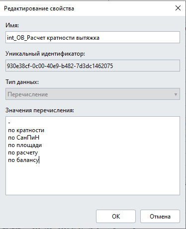 - int_ОВ_Расчет кратности приток, тип данных - перечисление. Сюда сразу напишем возможные варианты (-; по кратности; по СанПиН; по площади; по расчету; по балансу);