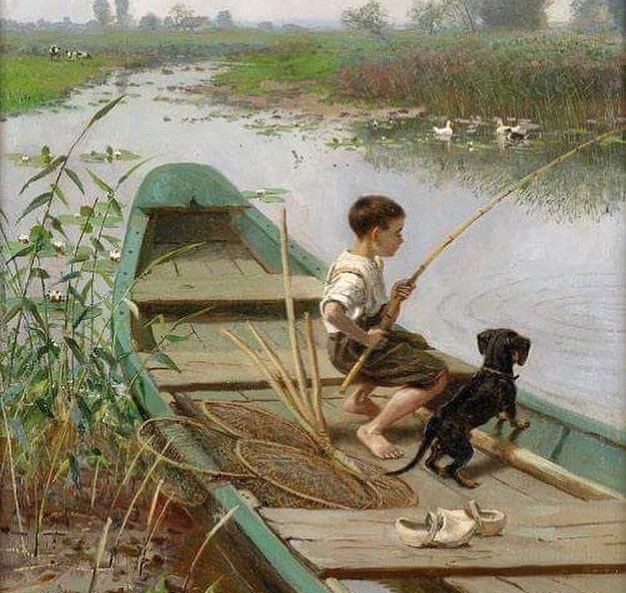 И вот я уже на берегу небольшой, прозрачной речки. Чуть в сторонке от пляжа увидела лодку, а в ней пацана с удочкой. В холщовой рубашке, в штанах, в кепке на голове. "А где же Даренка?" - подумала я и подошла поближе.