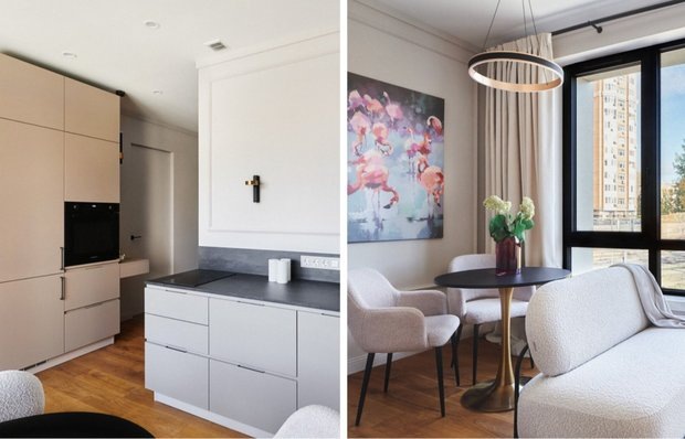 Простые и эффективные решения из проекта профи Организация пространства в небольшой квартире — задача не из простых. Но с творческим подходом и грамотным дизайном даже скромные метры можно превратить в уютное и функциональное жилье. Предлагаем классные идеи, которые мы подсмотрели в евродвушке из проекта дизайнера Евгении Акимовой — они помогут оптимизировать пространство и сделать вашу квартиру комфортной. Для малогабаритных помещений лучше всего подходят светлые и пастельные тона. Они создают эффект легкости и воздушности и визуально расширяют пространство. Чтобы оживить интерьер, в эту гостиную привнесли яркий акцент — картину в зоне столовой. А фактурная обивка мягкой мебели и уютный текстиль добавили объема и комфорта. В небольших помещениях следует избегать изобилия предметов и декора. Лучше выбрать несколько стильных аксессуаров, которые подчеркнут ваш вкус, но не перегрузят пространство. Для этой гостиной выбрали несколько цветных пятен: оригинальную яркую картину и живую зелен