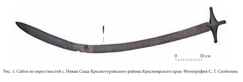 Культура русских первопроходцев Сибири, как промышленных людей, так и профессиональных воинов со своим особым укладом жизни и духовным миром, долгое время не привлекала внимание специалистов. К моменту организации целенаправленных этнографических исследований объект изучения фактически исчез, оставив еле уловимые следы в сибирском фольклоре. Лишь в последние десятилетия прошлого и в начале нынешнего века, когда были разработаны и опробованы аналитические модели оружиеведческого анализа, первоначально ориентированного на обработку комплексов более ранних исторических периодов, военная история периода освоения Сибири также стала активно изучаться. Благодаря систематическим и целенаправленным раскопкам позднесредневековых памятников был сформирован корпус источников по военному делу периода освоения Сибири [Митько, Тетерин, Борисенко, 2007]. Особое внимание уделялось сравнительному анализу «московского» огнестрельного оружия и вооружения дальнего боя коренных народов, в тактическом использовании которого ощущается центральноазиатское влияние [Митько, 2002; 2004]. Однако, согласно данным письменных, изобразительных и фольклорных источников, наряду с огнестрельным оружием эффективным элементом комплекса вооружения русских и кочевых воинов Южной Сибири продолжало оставаться длинноклинковое оружие [Бутанаев, 1981; Худяков, 2013]. В настоящее время фонд источников по средневековому рубящему и колющему наступательному оружию ближнего боя с территории Среднего Енисея более чем наполовину состоит из случайных находок, контекст обнаружения которых отсутствует либо крайне малосодержателен, что существенно снижает их научную значимость [Скобелев, Рюмшин, 2010]. Причем если в центральных музеях Красноярского края и Республики Хакасия сведения из учетных карт в большинстве случаев позволяют привязать находки к определенной местности и провести их картирование, то установление происхождения оружия, хранящегося в частных коллекциях, а также в небольших районных и школьных музеях, требует проведения дополнительных изысканий, включая поиск и опрос находчиков. В 2015 г. во время знакомства с коллекцией археологических предметов школьного музея в с. Новая Сыда, расположенном на правобережье Енисея в Краснотуранском районе Красноярского края, в числе прочих артефактов удалось осмотреть и описать саблю, являющуюся, без сомнения, его центральным экспонатом. Введение в научный оборот подобных артефактов позволяет уточнить ряд вопросов развития оружейного комплекса Сибири и расширить наши представления об исторических событиях на рубеже позднего Средневековья и начала Нового времени. Сабля была обнаружена в 1,5 км севернее села во время обработки пашни под посадку зерновых культур. Точное место обнаружения и глубину залегания находки выяснить не удалось. Известно лишь, что сабля была сломана на две части (вероятно, лемехом плуга), которые находчик соединил с помощью электросварки, проводя «реставрацию». Отсутствие следов вторичного термического воздействия позволяет считать, что она не была на погребальном костре. Сабельный клинок является цельнокованым, он не имеет дола, орнамента, рисунков и надписей. Почти прямой у рукояти клинок изгибается на расстоянии 2/3 от хвостовика. У клинка вытянуто-треугольное сечение, обух («с
