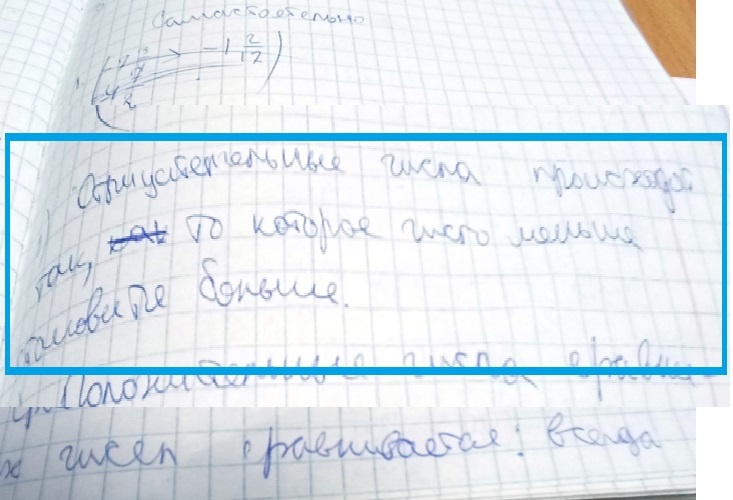 Продолжим разговор, начатый в предыдущей публикации Ситуация 2. Ученица 6 класса показывает результаты проверочной работы Нужно было ответить на несколько вопросов и выполнить практическое задание. Смотрим ответы. Первый вопрос "Как сравнить отрицательные числа?" Набор слов вместо правила, что из отрицательных чисел меньше то, модуль которого больше. Ещё "интереснее" ответ на вопрос "Как сравнить положительные числа?" Вообще то знаки "больше" или "меньше" используют для сравнения любых чисел. Единственный точный ответ дан на вопрос "Как сравнить положительное и отрицательное числа" Ответ на четвёртый вопрос не понятен. Вернее не понятен сам вопрос "Какое число сравнивают с нулём?" Если отрицательное, то ответ верный, а если положительное, то - нет Затем (в пятом задании) даны для сравнения совсем простые пары чисел, для которых ответ очевиден. Что не так? Как думаете, какая оценка стоит за работу? Любой учитель математики оценит между "2" и "3". Давайте в пользу ученика. Должна быть о
