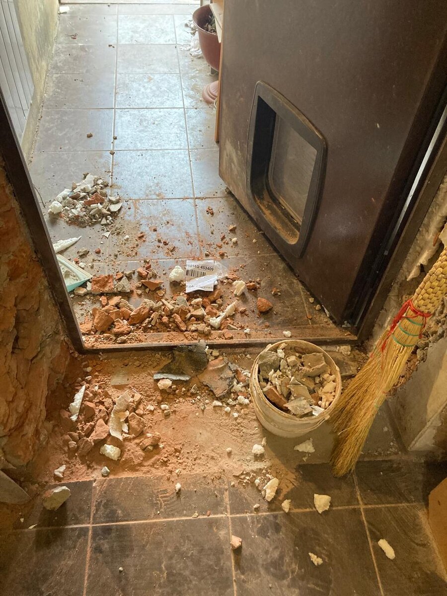 И это Мастер гору битых осколков за собой убрал уже. В ладонь снял этот качественный красный кирпич. А строительную пыль не протёр! Розовое вот это, видите? Оно - везде... Тонким слоем. Мы ж все двери демонтировали, кроме входной и двери в туалет. И мне сразу захотелось из дома сбежать куда-нибудь...
