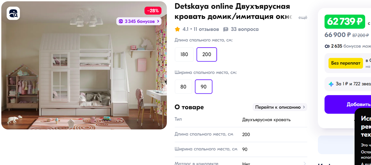 Визуально это было на 100% то, что нужно и цена при этом вполне адекватная. Продавцом оказался сайт «детская онлайн». Удивительное дело, но внимательно все изучив, я поняла, что заказ через маркетплейс обойдется гораздо дешевле, чем заказ напрямую с их официального сайта, поэтому отправилась оплачивать кровать через озон. Да и если уж совсем честно, то как-то спокойнее бы было оплатить такую сумму через проверенный маркетплейс, чем на неизвестном сайте.