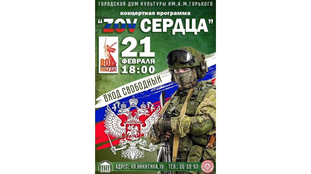 В преддверии Дня защитника Отечества, в Городском Доме культуры им. А.М. Горького состоится патриотическая праздничная программа "ZOV сердца". В концерте примут участие творческие коллективы учреждения: ансамбль эстрадного танца «Ассорти», театральная студия «Открытие», студия спортивного бального танца «Олимпия», студия современного танца «Шоколад», театр танца «Реверанс» и многие другие.