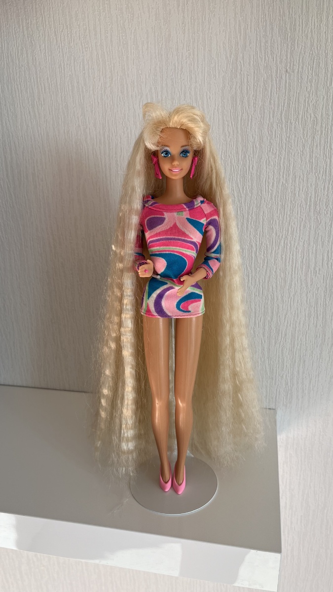 Давно тут ничего не выкладывала🙈 Обычно пишу длинные статьи в Дзене, но них не было сил 🙁 Сегодня расскажу про свою Тоталли. Barbie Totally hair (1991, Китай) Сначала конечно же планировала Малайзийского выпуска в коробке, но на них резко выросли цены, поэтому стала присматриваться к б/у китайского производства. Прошлой весной в Культ Кукле выставили целую партию тоталли блондинок. Там цены хоть и завышены, но мне нравится подача: куколки все с прическами, прибранные, аутфиты и туфельки уже подобраны👌🏻 У моей была красиво уложена челка, вверх, как у малазийской тоталли. У китайских обычно кудрявые. Во время поиска я даже высмотрела, что рисовка отличается не только в зависимости от страны производства, но и например среди китайских попадаются разные варианты. Мне больше нравится вариант слева, личико милее и куколка выглядит совсем молоденькой, но найти на норм теле так и не смогла.. Пришлось взять, что было в наличии. Я как обычно поторопилась. Если вот захочу какую-то куклу,