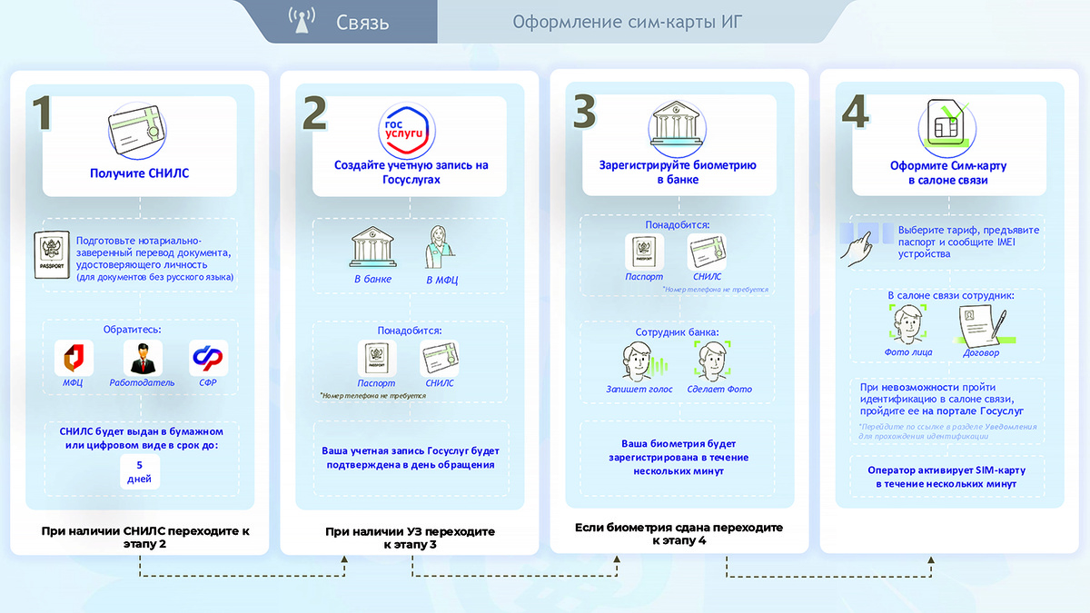 Министерство цифрового развития, связи и массовых коммуникаций России подготовило подробную инструкцию с процедурой приобретения SIM-карт иностранными гражданами. Согласно новым правилам, получение сим-карты станет возможным после обязательного выполнения следующих шагов: • нотариальное заверение копии паспорта; • получение СНИЛС в МФЦ; • создание личного кабинета на Госуслугах; • сдача биометрических данных в банке; • заключение договора на услуги сотовой связи путем личного визита в офис оператора; • предоставление оператору IMEI-кода устройства, которое будет использоваться вместе с сим-картой. Кроме того, с 1 ноября 2024 года вступили в силу требования закона №303-ФЗ: теперь владельцы страниц, блогов и каналов в соцсетях с аудиторией более 10 000 подписчиков обязаны передавать свои данные в Роскомнадзор. Регистрация необходима как физическим, так и юридическим лицам. Владелец должен подать заявление самостоятельно через Госуслуги. Сделать это можно при помощи своей учетной записи.