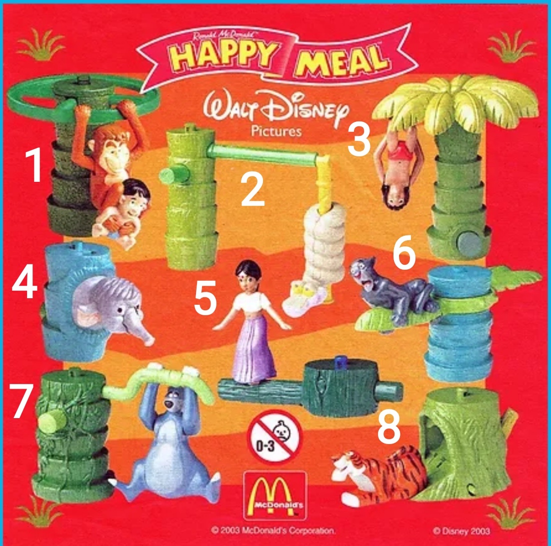 В серии Книга Джунглей 2 2003 от McDonald's к каждому элементу пальмы идут следующие герои :