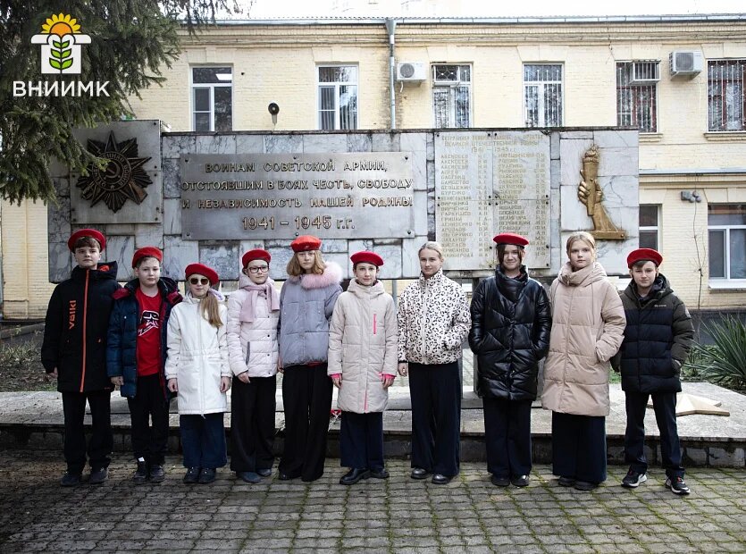 В России при поддержке Российского военно-исторического общества прошла Международная эстафета памяти «Красная гвоздика», приуроченная к 80-летию Победы в Великой Отечественной войне и году защитника Отечества. В рамках этой акции краснодарские юнармейцы посетили ВНИИМК, чтобы почтить память погибших в годы войны. Учащиеся краснодарской школы № 100, члены юнармейского отряда «Сокол», возложили цветы к мемориалу погибшим героям Великой Отечественной войны, установленному на территории ВНИИМК в честь его сотрудников, не вернувшихся с фронта. Во время визита юнармейцам рассказали о героической истории института в годы Великой Отечественной войны. В тяжелейших условиях сотрудники ВНИИМК совершили настоящий подвиг, сохранив уникальную коллекцию семян масличных культур, которая имела огромное значение для восстановления сельского хозяйства страны в послевоенные годы. Несмотря на то, что за годы оккупации Краснодара институт был практически полностью разрушен, его работники смогли не только с
