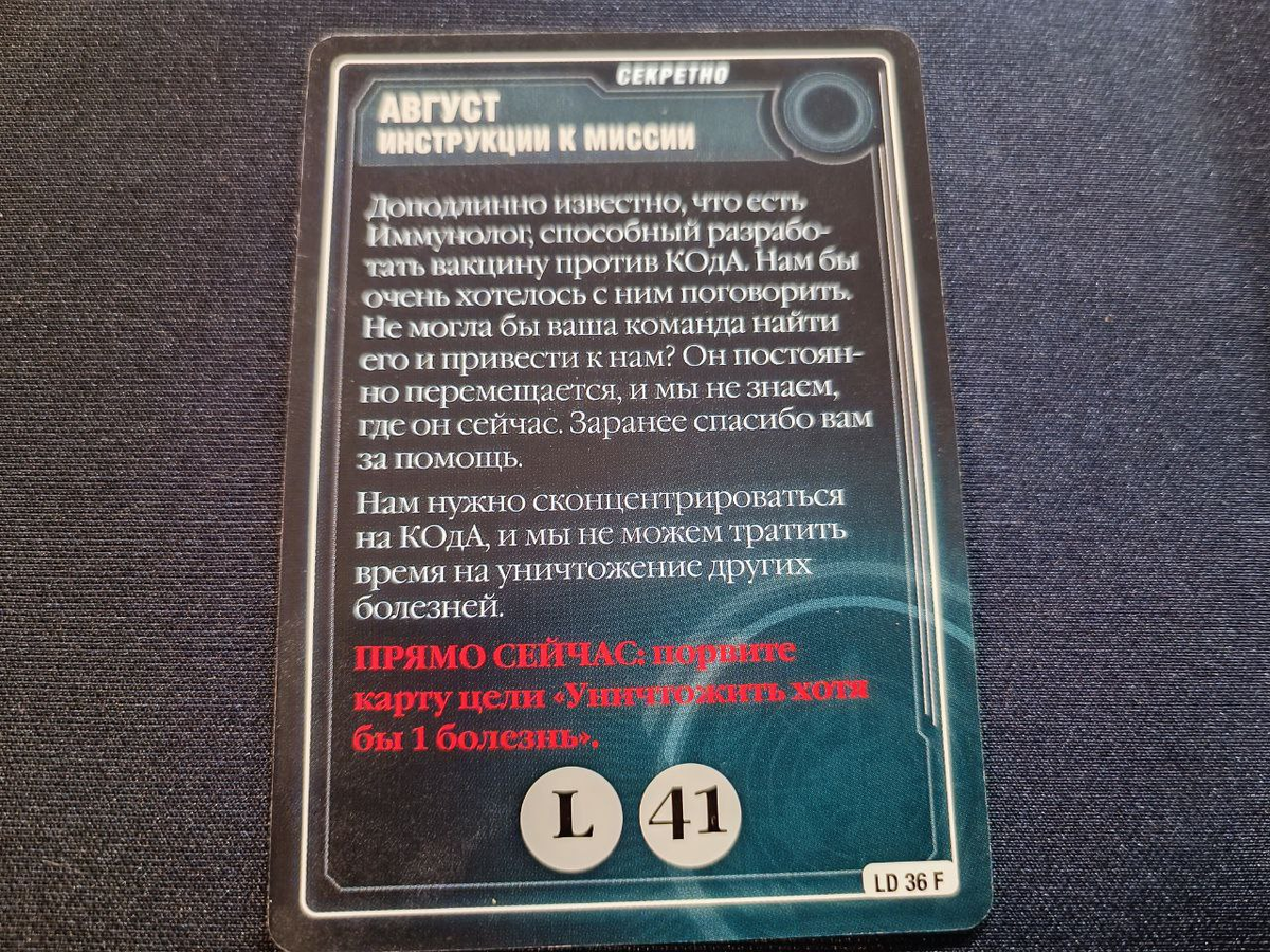 Полторы недели назад мы за четыре дня сыграли три партии в Пандемию наследия. И когда выдался свободный вечер у меня было желание сыграть во что угодно, только не в Пандемию. Последние партии проходили очень непросто, и хотелось немного расслабленной игры, а в Пандемии так играть нельзя. Вчера мы сыграли август. Первая карта подарила нам надежду на спасение планеты, но, естественно поставила новое условие. В игре появился иммунолог, которого тоже надо найти. Напомню в прошлой партии появилась механика поиска вирусолога. Также пришлось убрать цель по уничтожению болезни. Нам надо по прежнему выполнить три цели. И если строительство военных баз и изобретение лекарств реальны, то остальные три цели уже не так просты. Нужно найти вирусолога, или найти иммунолога или разместить 7 жетонов карантина. В игре теперь появилась механика самопожертвования, которая за шрам позволяет пропустить фазу обнаружения болезней. Думаю можно будет воспользоваться в конце кампании, чтобы не потерять персонажа