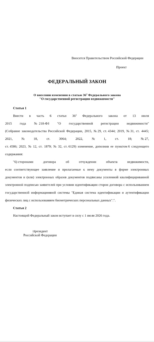 Регистрация недвижимости по биометрии🤦 20 декабря 2024 года в Государственную думу РФ внесли на рассмотрение законопроект о внесении изменения в статью 36-2 Федерального закона " О государственной регистрации недвижимости" ( в части применения единой биометрической системы при совершении сделок с недвижимым имуществом). 13 января 2025 года Совет Государственной думы РФ 🇷🇺 направил законопроект на согласование в том числе в правовое управление. Законопроект направлен на возможность представления заявления о государственной регистрации прав и прилагаемых к нему документов в форме электронных документов и (или) электронных образов документов, подписанных усиленной квалифицированной электронной подписью, при условии установления личности правообладателя посредством государственной информационной системы "Единая система идентификации и аутентификации физических лиц с использованием биометрических персональных данных" без необходимости внесения специальной отметки о возможности подач