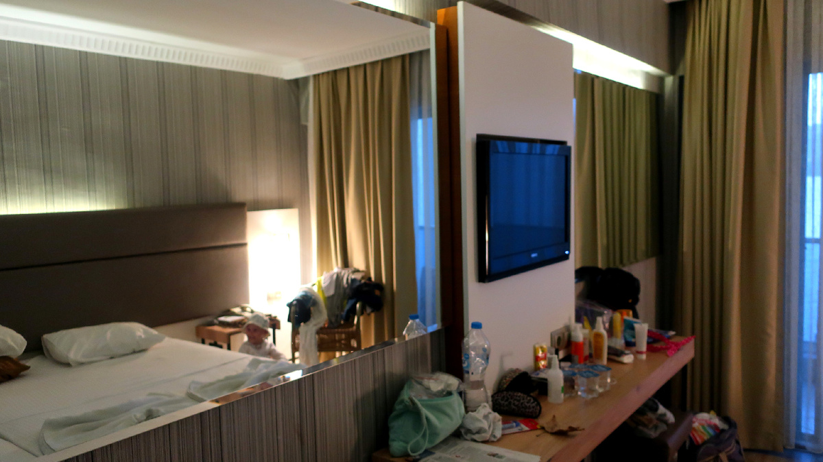 Приехав в отель нас сразу регистрировали и отправили кушать. Мы проходим в столовую (рестораном это назвать сложно), и меня охватил ужас (куда я привезла свою семью). Было очень темно, непонятная еда (к концу ужина ее почти не осталось), мы поели овощей, и пошли заселяться. Попросили детскую кроватку в номер, обещали принести, но за весь отпуск, были только одни обещания. У нас в номере была одна двухспальная кровать и 1 односпальная, мы их сдвинули и спали втроем. Нам дали номер в боковым видом на море, и был второй шок-музыка грохочет до двух-трех часов ночи. Но мы так устали с дороги, что быстро уснули, и музыка была нам не помеха. Хотели поменять номер с утра, но передумали, не стали тратить время на перенос вещей из одного номера в другой, т.к. у кого выходили окна на город, сказали еще больше шума.