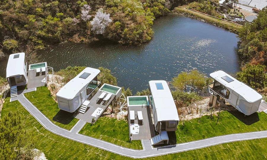 Конструкция из высокопрочной оцинкованной стали; Крышка из алюминиевой панели; Панорамные изолированные окна с двойным остеклением Размер: 8,5мХ3,3мХ3,2м; Изоляция: тепло- и шумоизоляция. Схема: Площадь: 28,0 кв.м Вместимость: 2 человека Общая потребляемая мощность: 10 кВт Общий вес нетто: 7 тонн Список конфигураций Система каркаса из оцинкованной стали Модуль корпуса из алюминиевого сплава с фторуглеродным напылением Система теплоизоляции, водонепроницаемости и влагостойкости конструкции Двери и окна из полого закаленного стекла Мансардный люк из полого ламинированного закаленного стекла Входная дверь из нержавеющей стали Панорамный балкон Система управления Панель включения/ выключения при вводе карты памяти Панель подсветки в мультиэкранном режиме Интеллектуальное интегрированное управление освещением/ шторами Интеллектуальное голосовое управление по всему дому Мобильный интеллектуальный контроль доступа Внутренняя отделка Потолочные и настенные модули стандартного цвета Экологическ