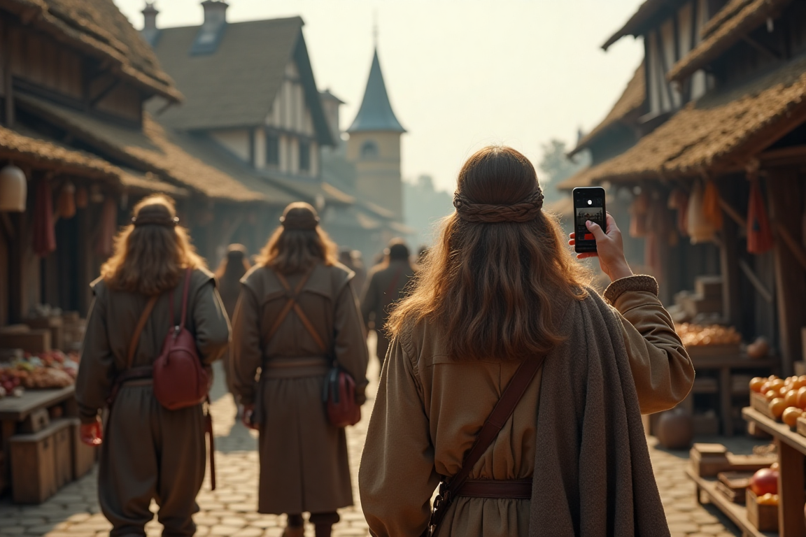 Утро в городе "Н" начиналось с привычного гула. Не с пения петухов, как это было раньше, а с синхронного звука тысяч уведомлений на средневековых смартфонах. Горожане, еще не открыв глаз, уже листали ленту новостей в приложении «Свиток». Главной темой дня был, конечно же, новый указ князя: «О запрете ношения красных башмаков для крестьян, дабы не нарушать гармонию и эстетику городского уклада». Комментарии кипели. Кто-то возмущался, кто-то поддерживал, а кто-то просто постил мемы с рыцарями, которые «тоже хотят новые башмаки». Толин, местный кузнец, проснулся от вибрации своего гаджета — «Кузнечный чат» взорвался сообщениями. Коллеги обсуждали, как теперь ковать набойки для новых башмаков. Толин вздохнул, потянулся и открыл приложение «Рыцарь-доставка», чтобы заказать себе утренний эль. Через пять минут к его двери подъехал всадник с термосом. «Рейтинг 4.7 из 5, — подумал Толин, — мог бы и быстрее». На главной площади города уже кипела жизнь. Рынок, конечно, никто не отменял, но тепер