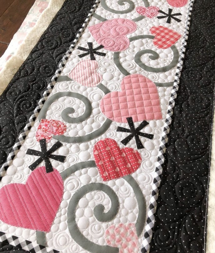 Когда я задумывала свой лоскутный календарь, идея состояла в том, чтобы каждый месяц на определённое место в доме вешать панно, характеризующее текущий месяц. Но, как выяснилось, не так просто найти тему для каждого месяца, да ещё такую, которую можно воплотить в лоскутном изделии. Ну, понятно, что есть времена года, каждое - со своими погодными условиями. Но вот чем, например, июнь отличается от июля? И как передавать в лоскутах весну или лето? Короче, есть над чем подумать. И вот у меня до сих пор висит панно к Новому году с ёлочкой: И тут стали мне на глаза попадаться подарки к дню всех влюблённых. И подумала я: А чего бы мне не сшить панно с сердечками? Тем более, что давно собиралась написать про аппликацию, а панно задумала именно с аппликацией. И пошла я на Pinterest за идеями. Нашла изделие, которое мне понравилось: Но мне хотелось именно панно. Поэтому я переработала этот вариант для своих нужд. Ширина моего изделия должна быть не больше 35см или 14". Бордюры я решила сделать