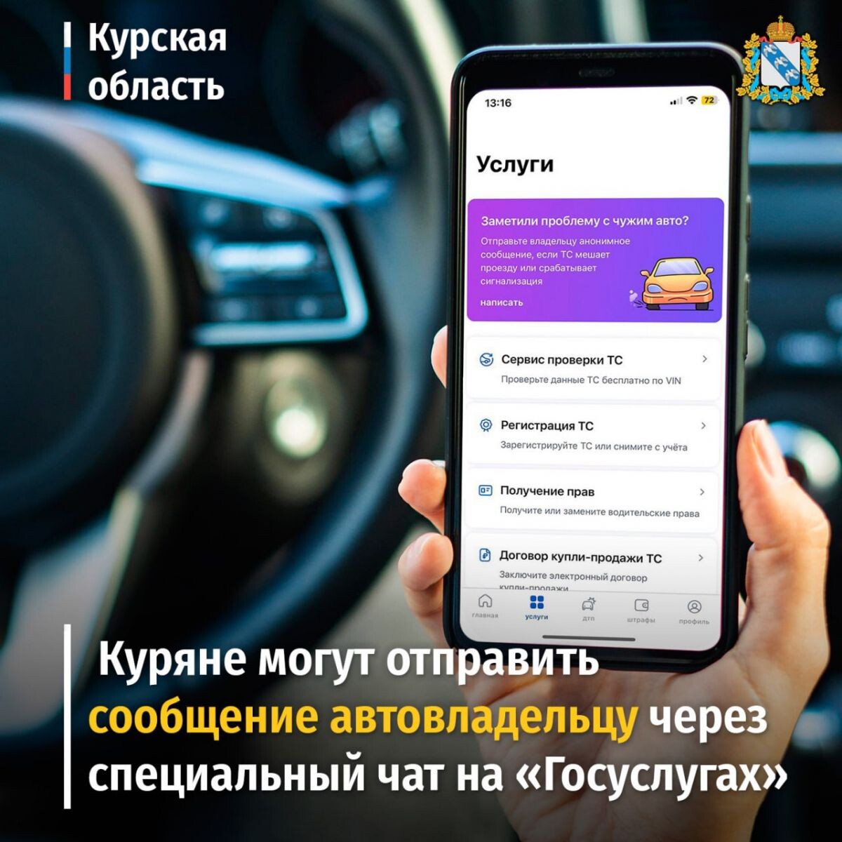 Пресс-служба Администрации Курской области сообщила, что теперь куряне смогут отправить сообщение автовладельцам через специальный чат на портале госуслуг. На ресурсе появился сервис «Сообщение о проблеме владельцу транспортного средства». Написать собственнику автомобиля можно через специальный водительский чат в приложениях «Госуслуги» и «Госуслуги Авто».