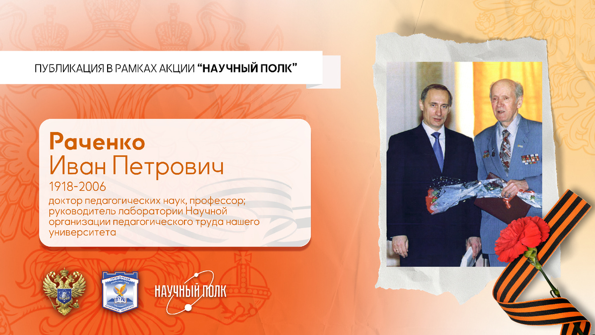 И.П. Раченко находился на фронте с 1942 по 1944 г. Прошел путь от курсанта до начальника штаба артиллерийского корпуса. Принимал участие в боях за освобождение Кизляра, Ставрополя, Харькова, Будапешта, Бухареста и ряда городов Болгарии. И.П. Раченко награжден орденами Отечественной войны I степени, Красной Звезды; медалями «За отвагу», «За оборону Кавказа», «За победу над Германией в Великой Отечественной войне 1941-1945 гг.». После войны Иван Петрович работал учителем, завучем, заведующим гороно г. Кисловодска. С 1966 г. Иван Петрович руководил лабораторией Научной организации педагогического труда в ПГПИИЯ. В 1967 г. стал кандидатом педагогических наук, доцентом. В 1977 г. защитил диссертацию на соискание ученой степени доктора педагогических наук. С 1978 г. – профессор. Отличник народного просвещения СССР. В 1999 г. И.П. Раченко присвоено звание «Заслуженный работник высшей школы Российской Федерации». В октябре 2000 г. И.П. Раченко удостоен медали лауреата Президентской премии