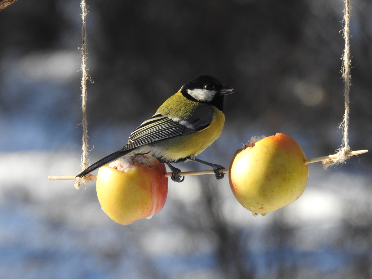 Да, такую кормушку можно повесить и не думать об ее утилизации, по крайней мере, в лесопарковой зоне. У меня такие кормушки в парке кто-то периодически ломает, тогда приходится отвязывать обрывки бечевки и обломки деревянной шпажки. Итак, берем яблоки, я брала 2 или 3, вырезаем сердцевину, но так, чтобы дно осталось, и укладываем внутрь мелко нарезанное сало вперемешку с семенами, орехами или арахисом. Можно сверху еще полить чуть-чуть растопленного сала. Протыкаете деревянной шпажкой или палочкой для суши, к концам привязываете натуральную бечевку, и на ночь можно в морозилку, чтобы начинка схватилась, а можно и сразу привязать к ветке.