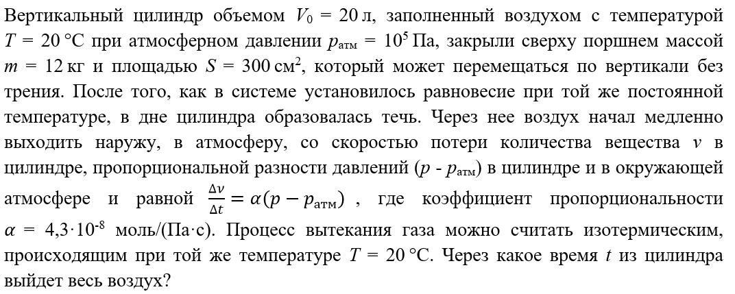 Полное условие задачи: Краткое условие задачи: Решение задачи: Поскольку процесс медленный, то вес поршня уравновешивается разностью сил давления воздуха на него снизу и сверху: откуда Таким образом, скорость потери количества вещества в цилиндре За малый промежуток времени Δt убыль числа молей воздуха в цилиндре равна За все время t из цилиндра вытечет число молей где начальное число молей можно найти из уравнения Клапейрона — Менделеева зная начальный объем, начальное давление и температуру: Подставляя это выражение для начального количества вещества в выведенную выше формулу, получаем: откуда искомое время равно Ответ: 1 ч 20 мин.